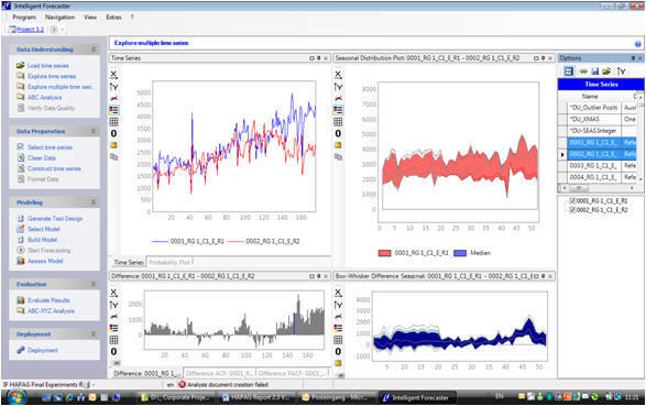 Intelligent Forecaster offers a variety of functions to analyze and transform time series. The functionality includes a variety of time series graphs, a variety of seasonal plots, autocorrelation plots, and PQ-scatter plots. In addition to descriptive time series statistics the functions include automatic tests of stationary series incl. augmented Dickey-Fuller tests, seasonality tests, trend-tests, automatic reporting facilities.  It further offers functions to analyze multiple series ... [find out more]